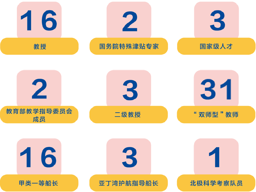 学院现有教职工100人,其中教授16人;在校生1880人(本科生1317人,硕士研究生446人,博士研究生117人)。学院设有航海技术、海事管理和导航工程等3个本科专业,其中航海技术专业、海事管理专业被列入国家“卓越工程师”教育培养计划专业,并入选国家一流专业建设点。学院牵头建设交通信息工程及控制、导航与信息工程、绿色船舶与环境保护等3个二级学科,拥有硕士、博士学位授予权,设有交通运输工程学科博士后流动站。