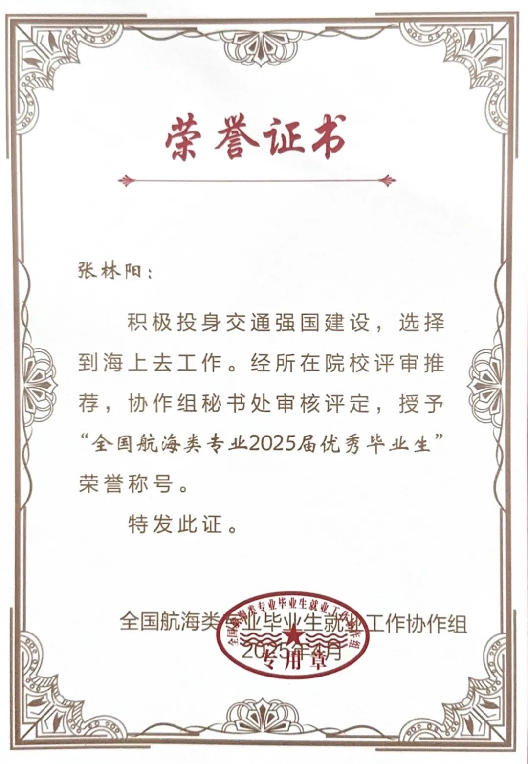 今年三月,张林阳代表学校参加了大学生职业生涯规划大赛,比赛现场,他以一段流利的英文引航指挥流程展示开场,向大家展现了航运学子昂扬向上的精神面貌和作为一名引航员的严谨专业的职业素养,并结合个人成长经历和未来规划回答了新一代航运人应当如何站稳时代浪潮、以身作则投入到“海洋强国”、“交通强国”建设之中的时代之问,最终取得了湖北省金奖的好成绩。凭借其优异表现和对航海事业的热忱,获评全国航海类专业2025届优秀毕业生称号。